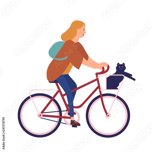 Pretty Young Woman Dressed In Casual Clothes Riding Bike With Cat